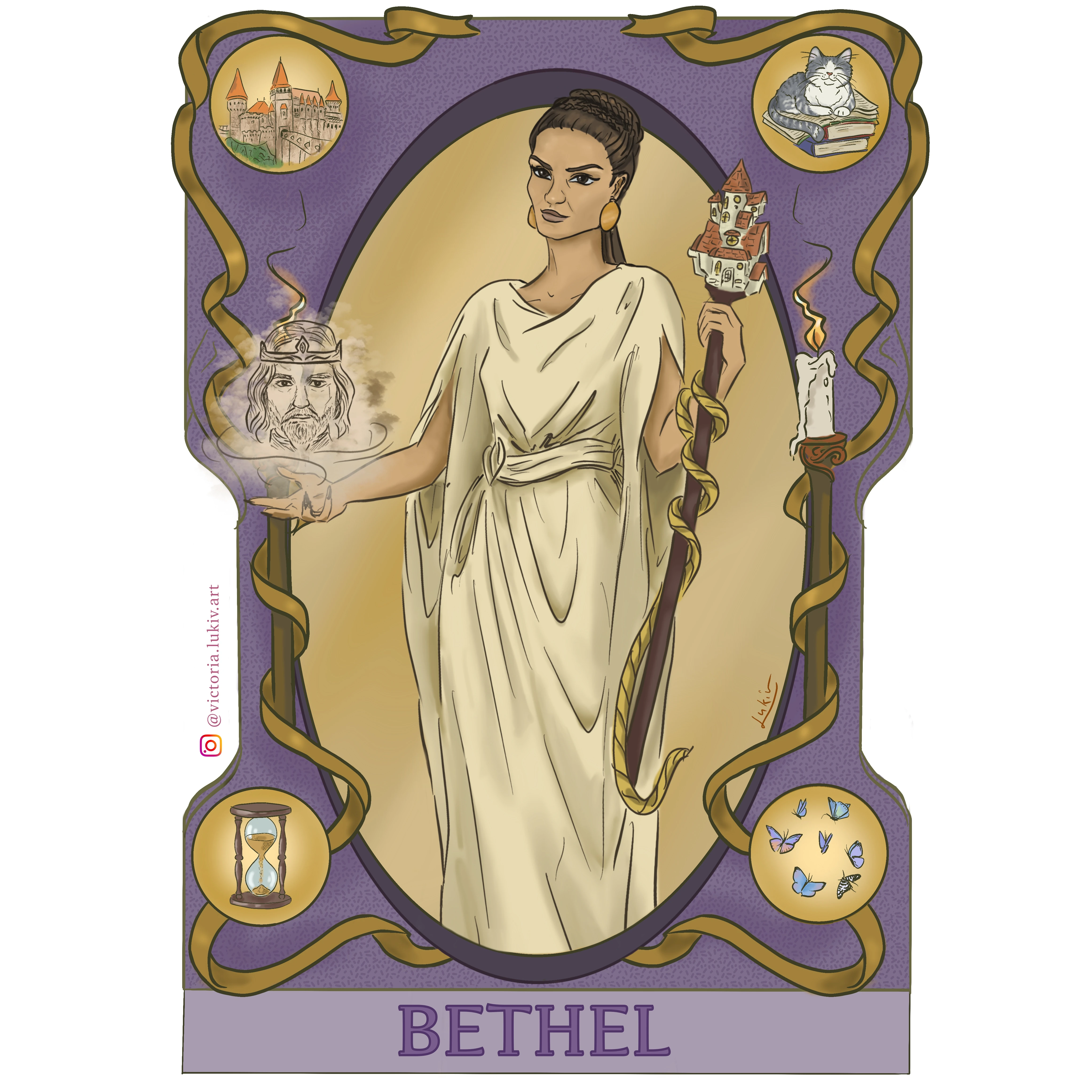 After consuming the Anyblade, Bethel can take any shape or property within the boundaries of what a house is.[1] Bethel's avatar looks like a nine foot woman with cedar colored skin, with dark brown hair twisted and coiled in a shape reminiscent of rope sitting at the top of her head. She often wears shimmering gossamer robes of a hundred layers.[2]